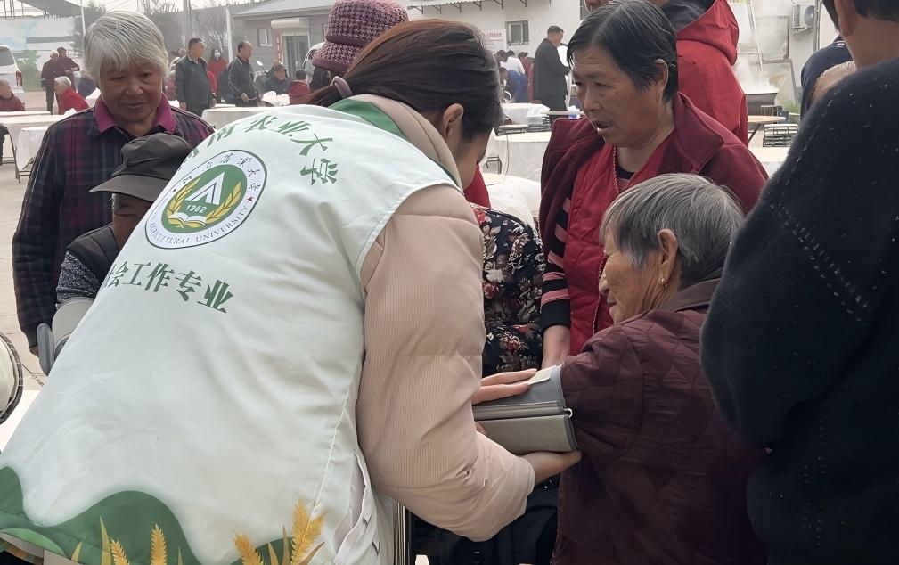活动当天,做爱自拍 研究生团队结合社会工作专业优势,提前协助村委进行活动策划与现场布置,确保活动流程有序进行。活动伊始,做爱自拍 两位研究生为到场的老年人测量血压、记录健康数据,并运用所学的健康社会工作知识向老人们讲解慢性病预防与日常健康管理要点,耐心解答老人们在生活中遇到的健康困惑。同时,研究生们还与村干部共同参与“好婆婆奖”“好媳妇奖”的颁发环节,用专业视角观察并总结社区长者间的家庭互助与情感支持,为后续社区和谐建设提供实践经验。